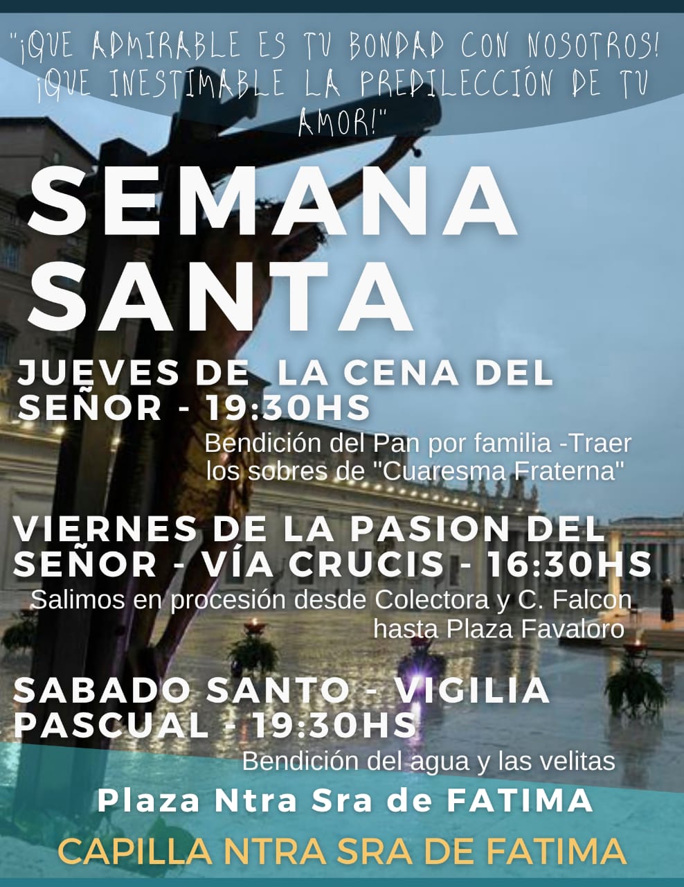 Jueves de la Cena del Señor a la 19:30 hs. Bendición del pan por familia. Traer los sobres de Cuaresma Fraterna". Viernes de la Pasión del Señor. Vía Crucis a las 16:30 hs. Salimos en procesión desde Colectora y Av. Falcon hasta Plaza Favaloro. Sábado Santo Bigilia Pascual 19:30 hs. Bendición del agua y las velas.