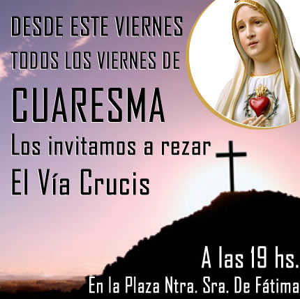 Desde este viernes, todos los viernes de cuaresma, los invitamos a rezar el Vía Crucis, a las 19 hs. En la Plaza Ntra. Sra. de Fátima (Av. Falcon y Lotero).