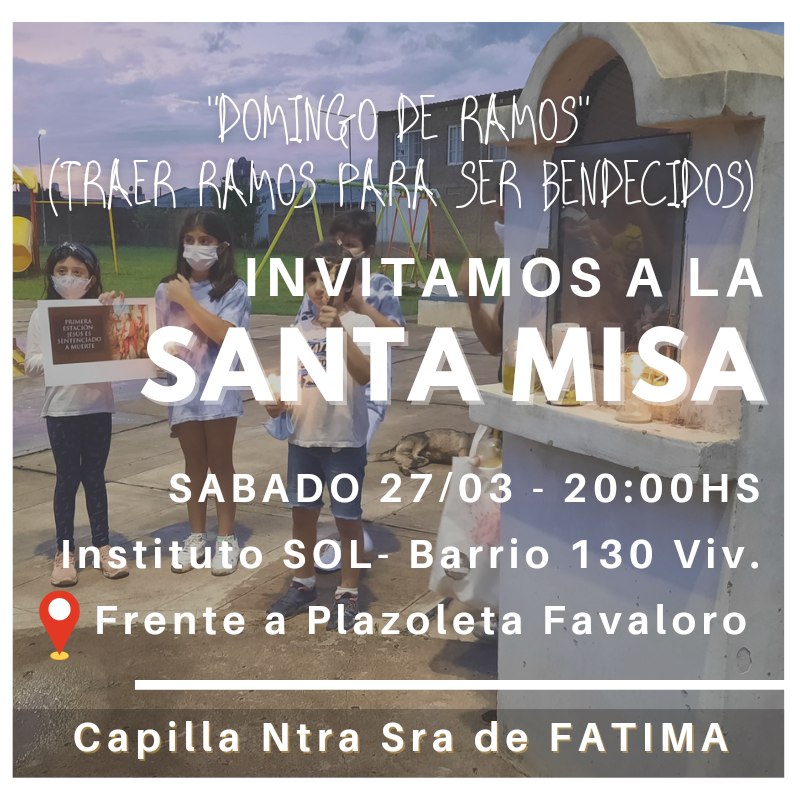 Los invitamos a la misa de Domingo de Ramos, a realizarse en el Instituto SOL del barrio 130 viviendas (frente a la plazoleta René Favaloro). Traer sus ramos para ser bendecidos.