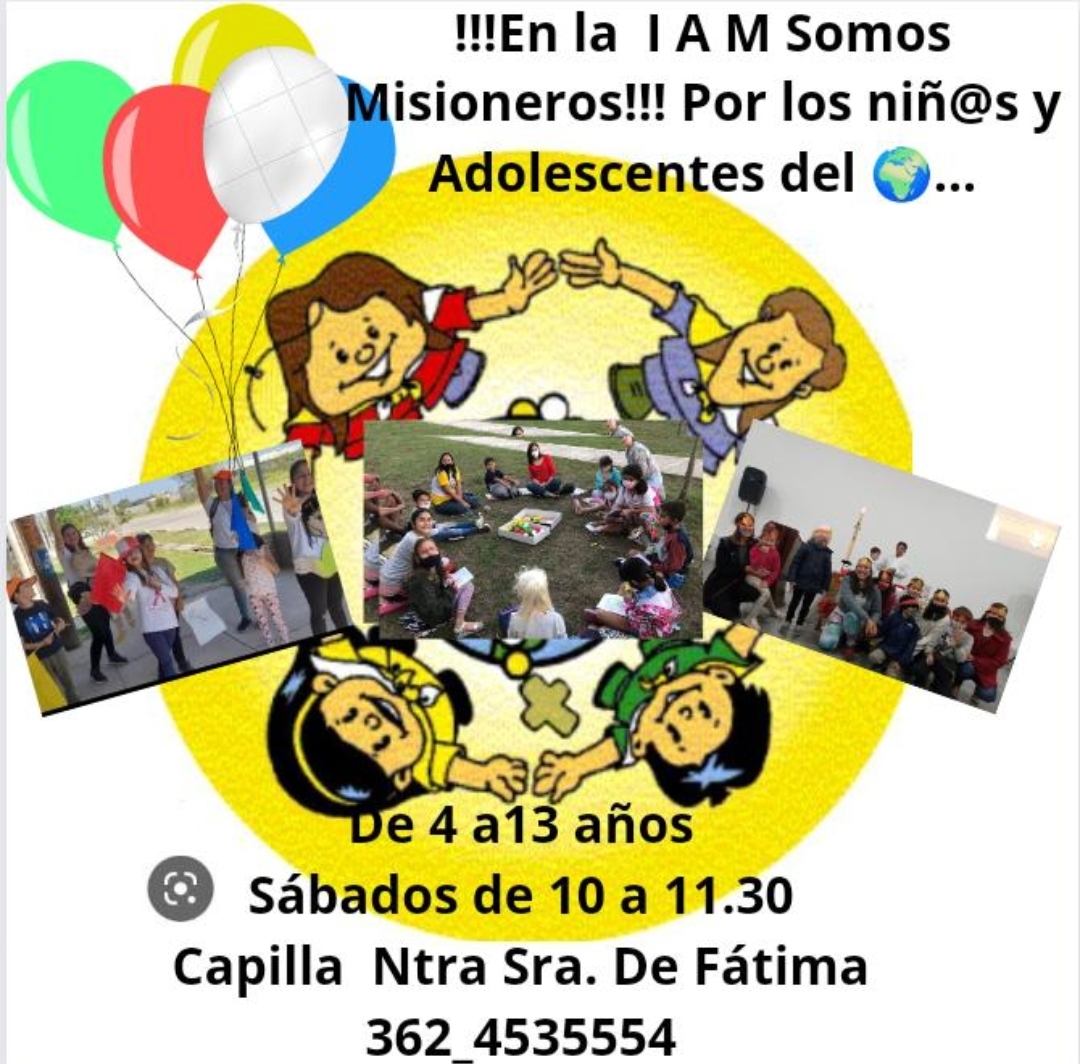 En la IAM somos misioneros! Por los niños y adolescentes del mundo. Inscripción abierta para niños/as de 4 a 13 años. Los sábados a la mañana en la Capilla de Fátima. Te esperamos!