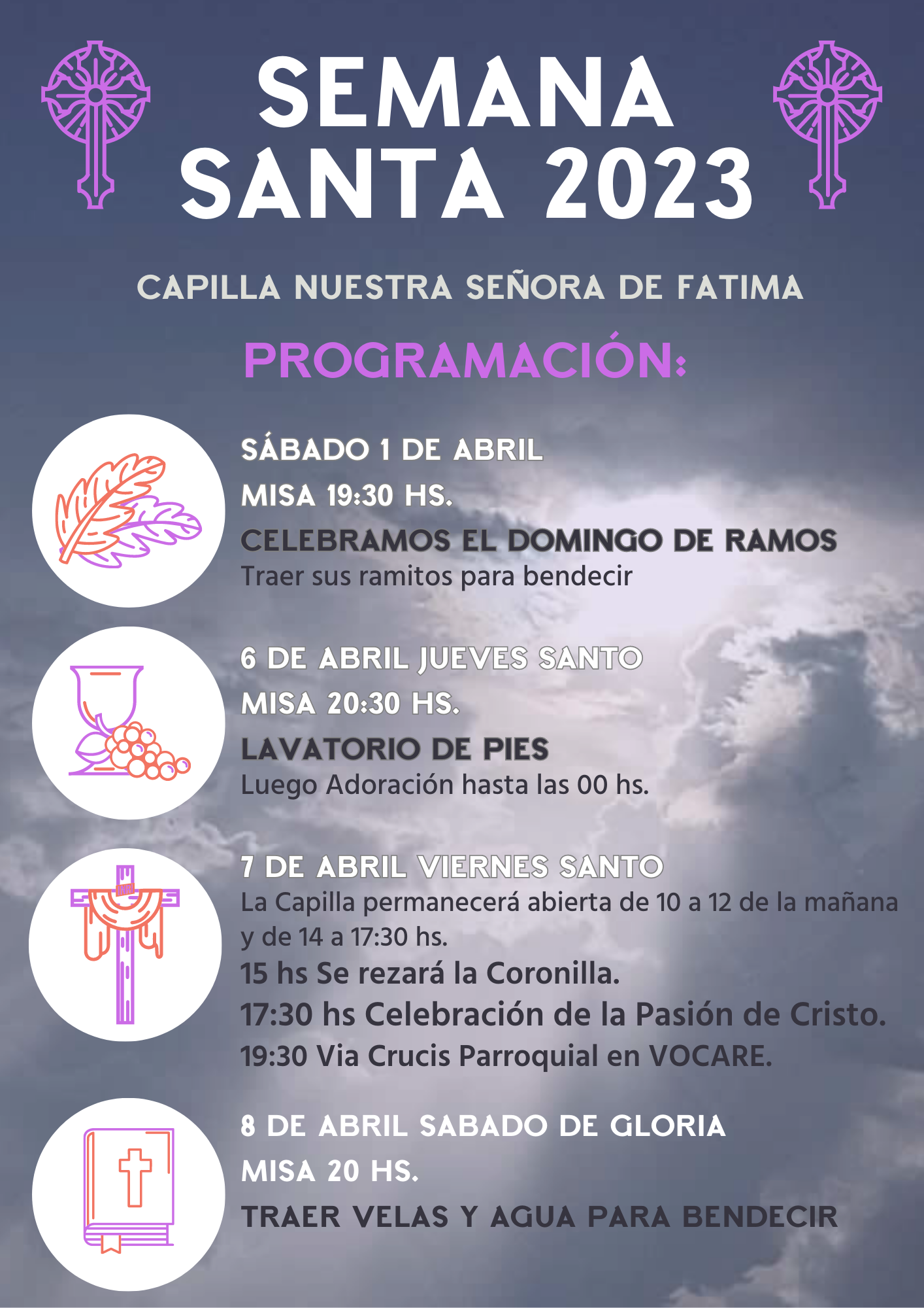 Querida comunidad: les dejamos aquí el Cronograma de actividades previstas en la Capilla para esta Semana Santa.